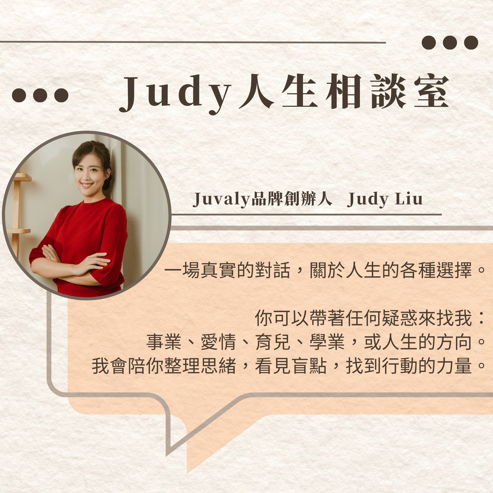 單次30分鐘,你可以帶著任何疑惑來到Judy相談室:事業、愛情、育兒、學業,或人生的方向。